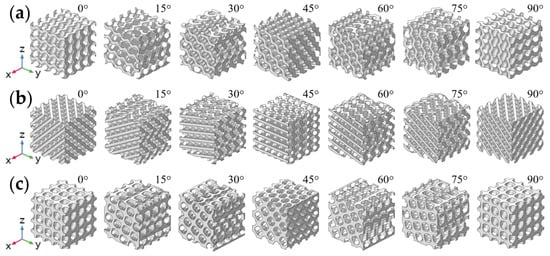 In this study, three types of TPMS structures (i.e., Gyroid, Diamond, and IWP) were designed using the open-source TPMS generator Flatt pack (UoN, Nottingham, UK) [42]. The dimensions of the samples were 12 mm × 12 mm × 12 mm, with each unit cell sized at 3 mm × 3 mm × 3 mm, as shown in Figure 1. The three TPMS structures (Gyroid, Diamond, and IWP) were rotated along the X-axis at angles of 0°, 15°, 30°, 45°, 60°, 75°, and 90°, resulting in 21 different models, as shown in Figure 2. The TPMS models were converted into 3D stereolithography (STL) files and imported into Materialise Magics (Materialise Inc., Leuven, Flemish, Belgium) to add supports for subsequent 3D printing.