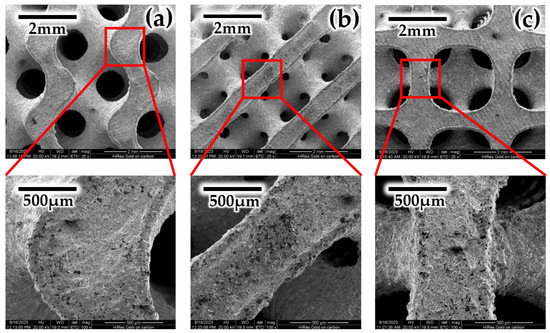 To ensure the reliability and accuracy of subsequent experiments, a quality analysis is performed after the completion of sample fabrication. This process not only helps to confirm the integrity of the printed samples but also enables the precise assessment of their printing accuracy, serving as a crucial guarantee for the success of the experiments. Images captured by scanning electron microscopy (SEM) are shown in Figure 4. The microstructure of the surface of samples is displayed, revealing a slightly rough surface that broadly reflects the shape and detailed features of the original model. This slight roughness may be attributed to the natural texture formed during the bonding or cooling process of the steel powder layers during printing [25,26]. It is noteworthy that almost no grains formed by the melted steel powder are found on the sample surface, indicating the stability of the material and the high precision of the printing technology during the forming process. This stability is crucial for ensuring the structural consistency and functional reliability of the printed samples. Furthermore, by comparing the pore diameters of the original model and the printed sample, it is found that the difference between them is minimal and almost negligible. Moreover, the outstanding performance of SLM was demonstrated due to the high level of consistency in detailed fabrication. The quality analysis of the printed sample confirms that samples printed using SLM exhibit high printing accuracy and good quality, thus ensuring the performance of the experimental samples in subsequent experiments.