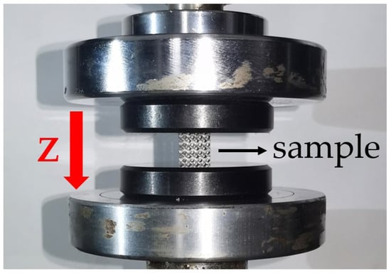 The ability of energy absorption of TPMS structures is fundamentally linked to its stress–strain relationship. In this study, the stress–strain relationships of TPMS structure samples were determined through quasi-static compression testing. In the experiments, a SANS compression testing machine was utilized, which can deliver a maximum load of 50 kN. A consistent quasi-static compression mode was applied at a rate of 0.5 mm/min. The setup of the compression tests conducted in this study is depicted in Figure 5. At the start of the experiment, this study ensured that the upper and lower compression platens were parallel and the sample was centered on the platform. On the compression testing machine, sensors were connected to the upper and lower platens. As compression proceeded, these sensors automatically collected reaction forces and displacement data from the platens. These data were processed by a computer and plotted into force–displacement curves.
