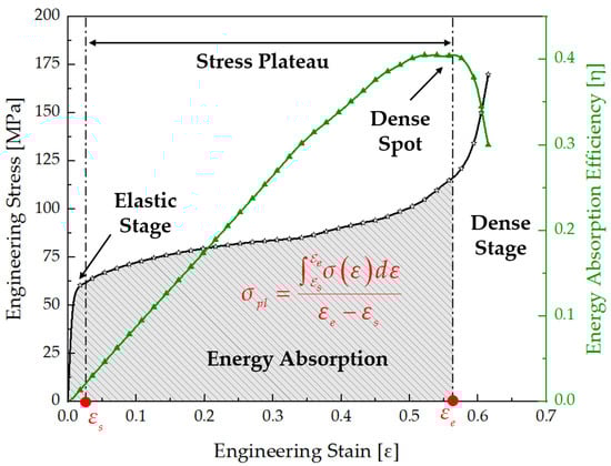Using Equation (5), the stress–strain curve of the structure can be converted into a curve of efficiency of energy absorption, as depicted in Figure 6. The area shaded in gray, bounded by the stress–strain curve and the curve of efficiency of energy absorption, represents the total energy absorbed by the structure during its compression stroke.