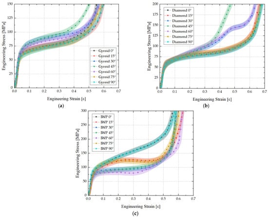 Stress–strain curves with different load-bearing angles: (a) Gyroid, (b) Diamond, (c) IWP.