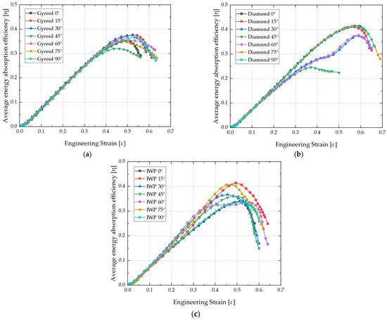 Average energy absorption efficiency curves with different load-bearing angles: (a) Gyroid, (b) Diamond, (c) IWP.