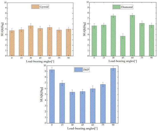 SEA of Gyroid, Diamond and IWP structures at different load-bearing angles.