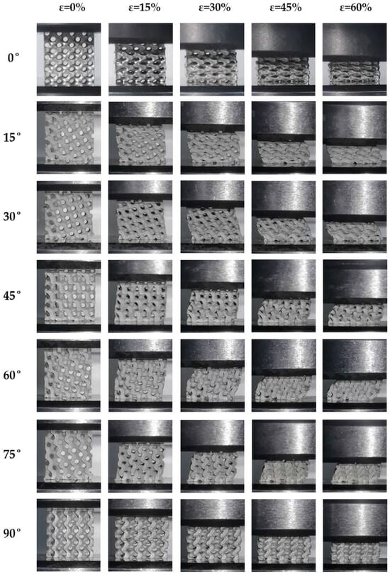 The deformation of the Gyroid structure was observed during the process of compression, as shown in Figure 10. At 0° and 90°, the compression of the Gyroid structure primarily induced axial deformation, accompanied by distortion in the thin-walled regions of the structure. These areas were relatively weaker and more susceptible to localized deformation, thereby confirming that the deformation of the Gyroid structure was bending-dominated during compression [14,48]. Throughout the process of compression, cell connections gradually twisted and squeezed together, leading to the progressive collapse of the structure, indicating its transition to a densified state where pore spaces at nodal connections were compacted, aligning with the strain-hardening effect observed in other literature [49]. At 15° and 75°, slight horizontal displacements occurred during compression, along with plastic collapse at the edges of the units. As compression continued, the overall structure experienced squeezing and gradually entered a densified state, with this phenomenon becoming more pronounced at larger inclination angles. At 30° and 60°, the horizontal displacement deformation of the structure was most significant, with more evident local plastic collapse. Initially, localized yielding collapse occurred at the edges of the structure, followed by a spreading collapse throughout the entire structure. Combined with the earlier observation of a slight increase in the plateau stress at 30° and 60°, it was evidenced that the phenomenon of localized collapse yielding can concentrate and enhance internal stresses within the structure to some extent. Overall, when subjected to external compressive loads, the deformation of the Gyroid structure was primarily bending at nodal connections. Its yielding behavior manifested as localized yielding failures at node connections, without the presence of distinct yielding bands being observed.