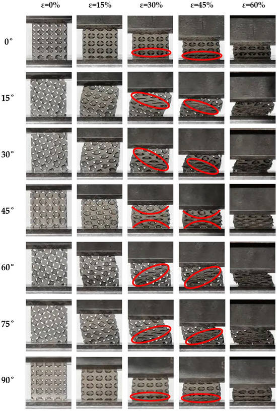 To explore the mechanisms underlying the impact of load-bearing angles on the performance of the energy absorption of structures, this section extensively discusses the deformation and damage experienced by the structure during the process of compression. By elucidating the internal changes and damage mechanisms within the structure, this study analyzed the fundamental factors contributing to variations in the capacity of energy absorption.