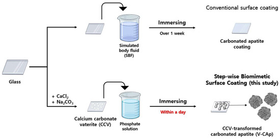 Schematic illustration of step-wise biomimetic surface coating (this study) compared to surface coating with SBF (conventional). The CCV was synthesized using the spontaneous precipitation method. The CCV was immersed in a phosphate solution to synthesize V-CAp, which is an immersing method. The objective of this study was to investigate the transformation of V-CAP in response to variations in immersion time and phosphate solution type.
