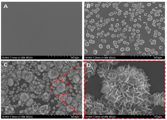 The morphology of CCV and V-CAp on template surface coating: (A) a glass surface, (B) CCV coating on a glass surface, and (C) V-CAp coating on a glass surface. (D) High magnification of V-CAp. CCV was produced using the spontaneous precipitation method, while V-CAp was produced through a 16-h immersion time at 37 °C.