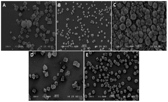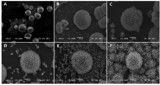 Figure 3 shows the SEM images of V-CAp formation using different types of phosphate solutions after 16 h of immersion. Figure 3A–C show the transformation of CCV to CAp using phosphate buffer (P buffer), phosphate solution type 1 (PS-1), and phosphate solution type 2 (PS-2), respectively. As shown in Figure 3B, the morphology of CCVs after immersion in PS-1 was not significantly different from before. CCV with PS-2 showed a significant transformation to V-CAp (Figure 3C). However, CAp formation in P buffer (Figure 3A), commercial PBS (Figure 3D), and SBF (Figure 3E) was difficult to observe. Monosodium phosphate ionizes to sodium cations (Na+) and dihydrogen phosphate anions (H2PO4−) when it dissolves in water. On the other hand, disodium phosphate ionizes to sodium cations and hydrogen phosphate anions (HPO42−). The formation of V-CAp with PS-2 is more rapid than with other tested solutions with the same immersing time, as the dihydrogen phosphate anions were less favorable to form carbonated apatite compared to the hydrogen phosphate anions [43]. In addition, CCV can also transform into calcite, which is the stable state of calcium carbonate, as observed in Figure 3A,D [44].