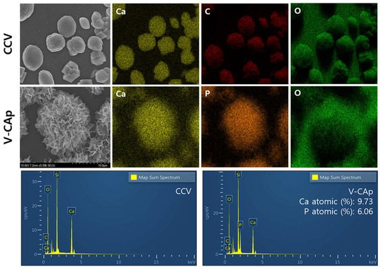 The composition of prepared CCV and V-CAp was analyzed using SEM-EDS. The CCV consisted of Ca, C, and O elements, which are the main components of calcium carbonate. The V-CAp consists of Ca, P, and O elements, which are the main components of carbonated apatite. The Ca and P ion’s atomic percentages were 9.73% and 6.06%, respectively (Ca/P mole ratio = 1.61).