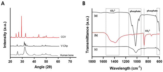 (A) CCV, V-CAp, and human bone were analyzed using XRD. (B) The functional groups of hydroxyapatite (a), CCV (b), and V-CAp (c) were analyzed through ATR-FTIR. The wavelength ranges of 550–600 and 960–1120 cm−1 were the represented phosphate group. The peak of 743 cm−1, 872 cm−1 and the wavelength range 1319–1470 cm−1 were the represented carbonate group.