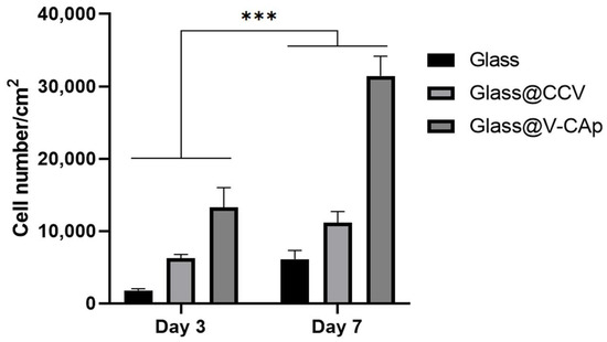 MC3T3-E1 cell proliferation after 3 and 7 days of culturing on glass with and without CCV and V-CAp. Cell proliferation was analyzed using the MTS assay. The cells were incubated at 37 °C in a 5% CO2 incubator for 3 and 7 days. The growth media was replaced every 3 days. Error bars represent the SD obtained from three replicates. *** p < 0.001.