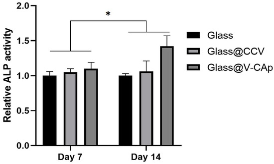 ALP activity of MC3T3-E1 cells on glass with and without CCV and V-CAp. The cell differentiation was analyzed using the ALP assay. The cells were incubated at 37 °C in a 5% CO2 incubator for 1 week. The medium was changed to a differentiation medium (same as above), and the ALP activity was measured after 7 and 14 days. The growth media and differentiation media were replaced every 3 days. Error bars represent the SD obtained from three replicates. * p < 0.05.