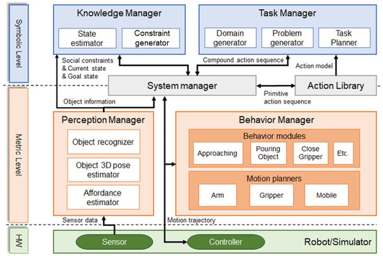 The system proposed in this study has a task manager, a system manager, an action library, a perception manager, and a behavior manager similar to the architecture proposed in our previous research [35,36], and in this paper a knowledge manager is modified to assign social constraints, which are constraints to reflect social behavior in motion. The relationship between the modules is shown in Figure 1.