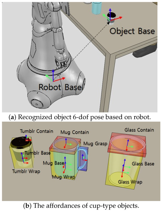 The functionality of each component of the detected objects must be known to the robot to perform activities that require social behavior in the manipulation of objects. It means that the robot requires the affordances of the object in addition to knowing what type of object it is. The perception manager records the position, orientation, and affordances of objects in three dimensions and sends them to the system manager using information from the vision sensor. The 6D posture information for a detected object is shown in Figure 2a and is derived using the robot’s base coordinate. Each functional component of the objects is represented by a 3D bounding box that contains the relative pose determined by the object’s base coordinate. As shown in Figure 2b, objects can be divided into several functional parts related to manipulation. For example, objects that can hold a drink consist of the following affordances.