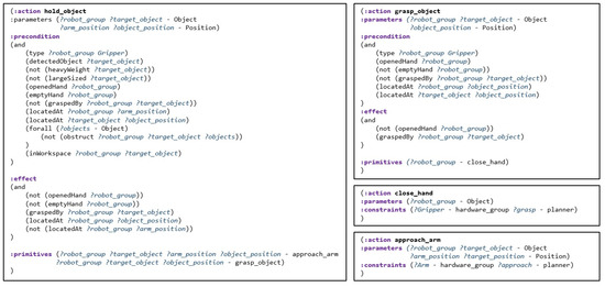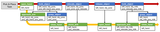 In the system proposed in this paper, the action library can provide all the necessary action information in the task plan and the motion plan. After obtaining the compound action sequence, the action library converts it into a primitive action sequence for motion planning. In defining the action model, the action library divides the actions into compound actions and primitive actions, and defines the network structure in which primitive actions are composed of compound actions. In addition, the action information defined in the action library includes parameters necessary for the task planner and motion planner. Figure 4 illustrates examples definitions of compound action and primitive action in the action library. Each action is defined by applying the PDDL style and syntax to describe scripts to increase the convenience of editors and to easily apply the existing PDDL planner. Based on the action definitions in PDDL, we define the precondition required to perform each action and the effect that describes how the environment will change after the action is executed. In addition to syntax based on the PDDL format, primitives defines what actions the compound action consists of and constraints defines which motion planner the primitive action should be planned with, and these are added. A more detailed definition of the action library and network structures is applied to the methodology of our previous research [35]. Figure 5 illustrates an example of the decomposition of an action sequence for pick-and-place task. The task involves first relocating the juice that is blocking the way to grasp the milk. As a result of task planning, an action sequence consisting of compound actions is generated, following the red arrow. Next, to perform motion planning, the actions are decomposed according to the defined primitives, resulting in a primitive action sequence following the yellow arrow.