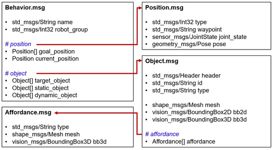 The behavior manager manages modular motion planners to perform motions corresponding to primitive actions. The implementation of the behavior manager module adds a method to reflect social constraints in addition to the method in our previous work [35]. The behavior manager uses the particular behavior modules acting as motion planners to calculate a collision-free trajectory that robot can move along to execute the primitive action and checks to see if the execution is feasible after receiving the current action that needs to be executed and the parameters required in motion planning. Each module has different required and optional parameters for planning. The inputs of the modules for manipulation planning are the current and desired pose of the end-effector and 6D pose data of the objects and obstacles. The input information of the mobile path planning modules includes two-dimensional current coordinates and goal coordinates in the grid local map. We defined the data format as shown in Figure 6 for general use in motion planning, including input parameters and affordances of objects to be used in various motion planners. These data, defined as the ROS message, include not only the name of the action and the robot group to perform the action but also the position and object messages defined as lower-level messages, which correspond to the type of geometric variable of the primitive action defined in the action library. In this paper, motion planners corresponding to primitive actions in action library are implemented for experiments in Section 3 that provide services in various task domains, and some of the lists are as follows: