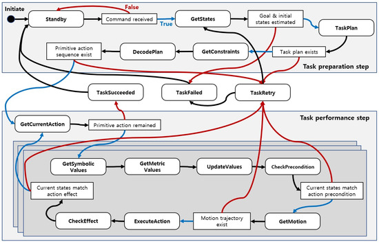 The system manager obtains data for the current task from various modules and transfers the state until it meets the user’s demand in accordance with the state transition model specified by the state machine. We showed in Section 3 that this state machine is applicable to task domains of any complexity and is designed to determine the order of operations between modules within the proposed system. Task states are divided into task performance and task preparation processes, and we have newly defined and added several states to reflect social constraints in addition to those defined in previous studies [35]. The predefined task state and transition rules are as shown in Figure 8, and the operation methods of the modules in each state are as follows.