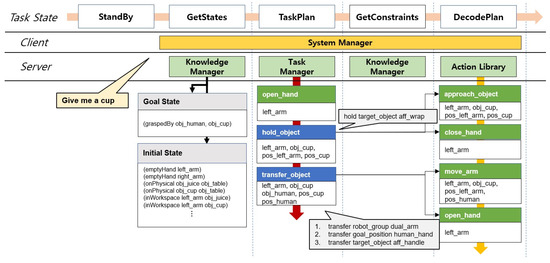- GetStates: When the user orders the robot, commands are transferred to the knowledge manager from the system manager. Then, knowledge manager infers to determine the goal states for the command’s execution as well as the current states of the robot and task environment. Then, the system manager receives a response from the knowledge manager. If inference fails, it is determined that the intent of the user command is not grasped and task state moves to the Standby to obtain the user’s command.