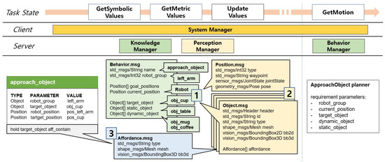 After a primitive action sequence is decomposed from compound action sequence, the primitive actions are popped one by one in the sequence. Figure 10 shows the process of allocating values to the behavior message for the approach_arm behavior obtained in Figure 9. The system manager first retrieves symbolic values and action parameters from the action library, as well as geometric parameters from the behavior manager. In the behavior message, symbolic values are assigned to the parameters corresponding to the action parameters and required parameters, and the static_object and dynamic_object that are not assigned are automatically assigned a list of objects recognized by the perception manager. Geometric values corresponding to parameters assigned symbolic values are retrieved by the system manager from the perception manager, and symbolic values are overwritten by the corresponding values in the position or object message. Since conditions for wrap affordance are provided to the current action in the previous GetConstraints state, wrap affordance of the cup, which is a target_object, is obtained from the perception manager, and the affordance message is added to the object message to consider the affordance in the motion planning state.
