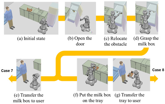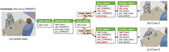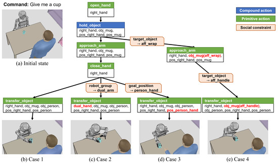 Cases 1–4 are the results of the task that the cup is located on the table and a human requests a cup as shown in Figure 11 Then, the following primitive action sequence is obtained from the task planning: (i) open_hand (right_hand); (ii) approach_arm (right_hand, obj_mug, pos_right_hand, pos_mug); (iii) close_hand (right_hand); and (iv) transfer_object (right_hand, obj_mug, obj_person, pos_right_hand, pos_person).
