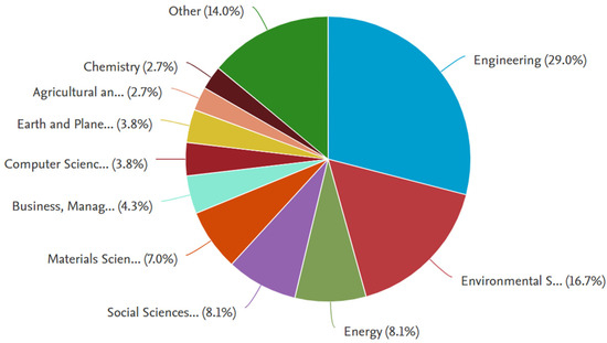 Further analysis into the publications found on SCOPUS suggests that the topic under investigation has received a relatively equal percentage of interest amongst researchers in the fields of Energy and Social Sciences, with the highest interest being in Engineering, followed by Environmental Sciences, as shown in Figure 2, which further supports the notion that there is a need to consolidate the acquired knowledge in all three fields in a comprehensive approach to effectively address the topic of interest.