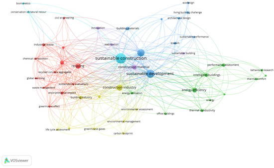 Additional analysis into the trending keywords using VOS Viewer relied on the criterion of selecting keywords that appeared two times or more within the 89 selected articles. As a result, 21 publications showed several links between multiple terminologies emerging from the topic of interest, such as biophilia, living building challenge, architectural design, sustainability, sustainable construction, living buildings, energy efficiency, thermal comfort, and biophilic design, amongst others, as shown in Figure 3. Accordingly, this analysis further supports the notion that the consolidation of biomimicry, biophilic design, living building, and sustainable features has started to capture the interest of researchers, with potential for further enhancements and developments in the future.