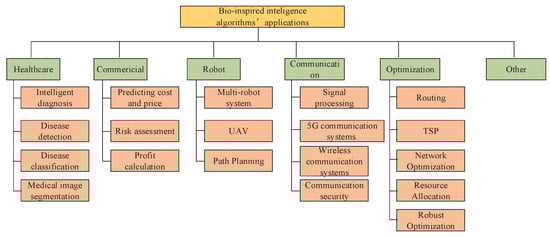 Neural networks and bio-inspired optimization algorithms have many intersections and correlations. Firstly, bio-inspired optimization algorithms are widely used in neural network parameter optimization [,]. Especially in [], the author paid special attention to the optimization of recurrent neural network parameters using bio-inspired optimization algorithms and provided a comprehensive analysis. Secondly, neural networks and bio-inspired optimization algorithms are used in common applications, and they are always used for comparison, such as comparing intelligent feature selection and classification [,], as well as structural health monitoring [].