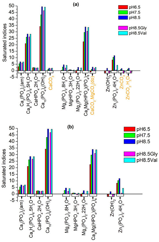Calculated saturation indices (SIs) of the salts that might have precipitated in the biomimetic SBF/AS-CaCl2-MgCl2-ZnCl2-K2HPO4-H2O and SBF/AS-CaCl2-MgCl2-ZnCl2-K2HPO4-Gly/Val-H2O systems under study are presented in Figure 1.