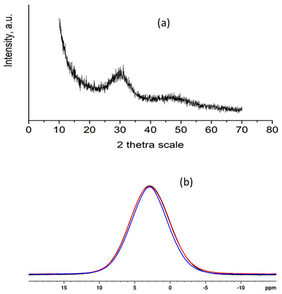 X-ray powder pattern of the sample obtained in Series B in the presence of AS and valine (a,b) direct excitation 31P NMR spectra of CP-AScp (black), CP-ASf (red), and CP-ASgb (blue) samples.