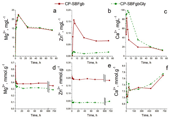 To study the behaviour of the obtained precipitates in an artificial saliva environment, we chose CP-SBFgbGly and CP-SBFgb due to the most significant difference in the concentrations of Mg and Zn in the precipitated solid phases (Table 3). We monitored the changes in the contents of Mg2+, Zn2+, and Ca2+ ions in the liquid (up to the 72nd h, before the replacement of the artificial saliva) and solid phases (up to the 720th h) with time. The results showed a similar behaviour of the two studied solid phases, manifested by changes in the composition of both solid and liquid phases (Figure 3), most clearly expressed during the first 24 h.