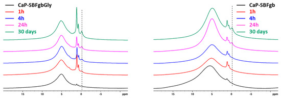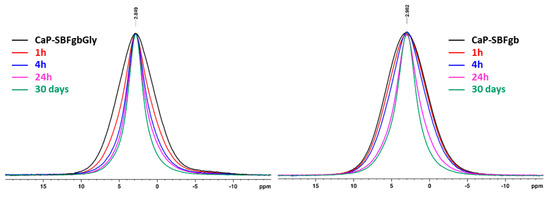 Figure 4 presents the direct excitation 31P spectra of the samples from the two series. The spectra of the parent CaP-SBFgbGly and CaP-SBFgb represent a broad spectral pattern centred at around 2.9 ppm that is characteristic of the amorphous apatite phase. The overall linewidth of the resonance of the CaP-SBFgb was slightly broader (1562 Hz) compared to the CaP-SBFgbGly (1434 Hz).