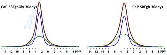Direct excitation 31P NMR spectra of the samples CaP-SBFgbGly-30 days and CaP-SBFgb-30 days incubated in AS for 30 days. The experimental spectra are in black, while the simulated spectra are in red lines. The deconvoluted 31P spectra show the individual contributions of the two components, indicating the presence of crystalline (blue) and disordered amorphous phase (green).