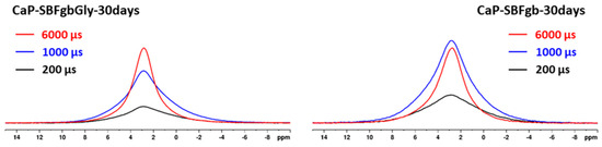 1H-31P CP-MAS spectra of the samples CaP-SBFgbGly-30 days and CaP-SBFgb-30 days at three different mixing times of 200 µs (black), 1000 µs (blue), and 6000 µs (red).