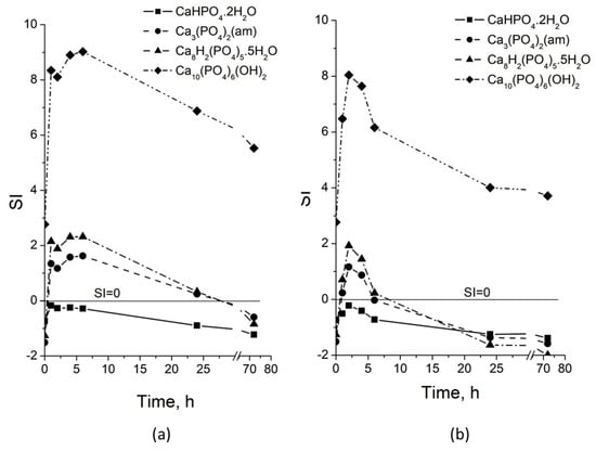 The kinetic studies supported the thermodynamic calculation of saturation indices (SIs) of possible solid phases in the artificial saliva at different maturation times. The initial saliva (Figure 8) is only supersaturated (SI > 0) concerning the Ca10(PO4)6(OH)2. The dissolution of the amorphous phase leads to an increase in the saturated indices of Ca3(PO4)2(am), Ca8H2(PO4)6.5H2O, and Ca10(PO4)6(OH)2 to the 6th h for CP-SBFgbGly (Figure 8a) and to the 2nd h for CP-SBFgb (Figure 8b), making them positive, indicating supersaturation of the solutions concerning these salts. The subsequent decrease in SI values was related to spontaneous precipitation. The supersaturation concerning Ca3(PO4)2(am) and Ca8H2(PO4)6.5H2O is going after 6th h by CP-SBFgbGly and after 30th h by CP-SBFgb (SIs become negative). This reveals that higher concentrations of Mg and Zn in the CP-SBFgb (Table 3) stabilise the amorphous phase and delay its recrystallisation into the thermodynamically stable phase, hydroxyapatite, whose saturation index remained the highest and positive throughout the studied interval.