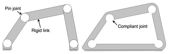 Historically, many compliant mechanisms were designed through trial and error, limiting their applicability to very simple systems. This approach is often not cost-effective for numerous potential applications. Despite recent efforts to streamline analysis and design processes, it is important to acknowledge that working with compliant mechanisms generally presents greater challenges than dealing with rigid-body mechanisms. A four-bar linkage is a reliable mechanism capable of efficiently transferring input motion in parallel directions, making it directly applicable to typical use cases (e.g., locking pliers and pantographs) and indirectly applicable in other mechanisms with more linkages. The conventional four-bar mechanism has also been executed in the design of a cable-driven, articulated, robotic landing gear (RLG) for vertical takeoff and landing (VTOL) [], as shown in Figure 1 (left). The authors’ team is actively pursuing creative ways to advantageously implement flexure hinges in such aerospace applications (Figure 1, right). A four-bar mechanism and the equivalent compliant mechanism are depicted in Figure 2.