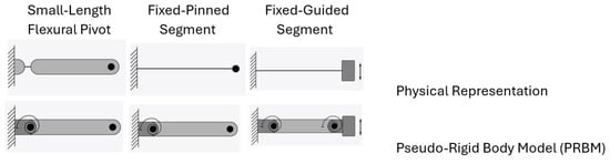 The finite element method (FEM) and the Pseudo-Rigid-Body Model (PRBM) play crucial roles in analyzing compliant mechanisms. FEM has been widely used in this field, providing detailed insights into the behavior of flexure members []. The basis for the FEM is discretization of the structure into a finite number of elements and interpolation of scalar field variables (e.g., components of deflections) at the vertices of the element (also called nodes), using what are known as shape or interpolation functions of approximation space []. Parametrization is an essential ingredient in the FEM-based analysis of compliant mechanisms, modeled as elastic deformable structures. The PRBM [] simplifies the design and analysis of compliant structural elements, as shown in Figure 3 adapted from Reference [], for three boundary conditions. A preliminary design can be created using the PRBM and then optimized to fulfil the specified design requirements. The resulting design might then be further refined using such approaches as nonlinear FEA, before being prototyped and tested.