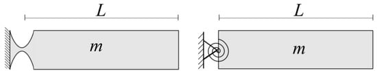 The assumptions include the precision of CFHs in rotation, with minimal displacement of their center of rotation compared to other flexure hinges. To validate these assumptions, insights from Dirksen and Lammering’s research (2011) [] emphasized the significantly larger motion of the center of rotation for rectangular flexure hinges compared to CFHs, attributed to the deflection of the entire hinge length ‘L’. Additionally, the study underscores the relevance of natural frequency in systems with rigid bodies connected to flexure hinges under dynamic loading conditions, as illustrated in Figure 6 (left). Their conclusion aligns with the modeling of flexure hinges using discrete torsional springs, as depicted in Figure 6 (right), leveraging the rotational compliance or bending stiffness.