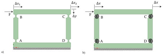 where is the equivalent torsional stiffness (see the torsional spring added in Figure 7). When conducting a Pseudo-Rigid-Body Model (PRBM) analysis of a four-bar compliant mechanism, the (flexure) hinges depicted in Figure 8a [] are replaced with torsional springs, as demonstrated in Figure 8b. The system was confirmed to exhibit identical horizontal deflections, and , i.e., 1-DOF, and near-zero undesired []. This further validates the assumption of each bar acting mostly as a rigid-body mechanism with torsional springs and a horizontal displacement of , when an input force () is applied.