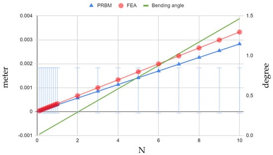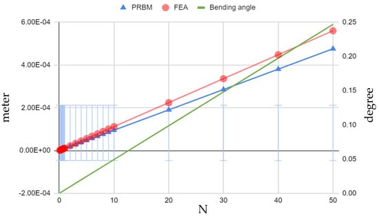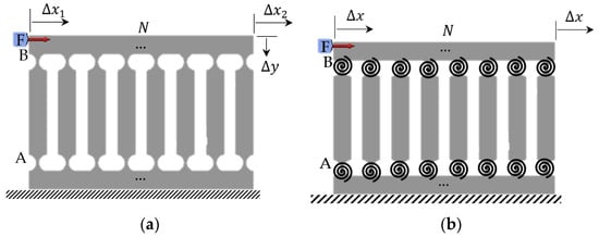 Continuing with the four-bar PRBM analysis, a general PRBM of parallel compliant mechanisms can now be investigated. Consider a 2N-bar compliant mechanism consisting of N vertical linkages with two flexure hinges at each linkage, N − 1 couplers, and one base (fixed) bar. In this case, the 2N flexure hinges are replaced with 2N torsional springs, as depicted in Figure 9. Like the previous 4-bar system, applying an input force, F, results in a horizontal displacement of ∆x. The system exhibits near-zero undesired vertical displacement .