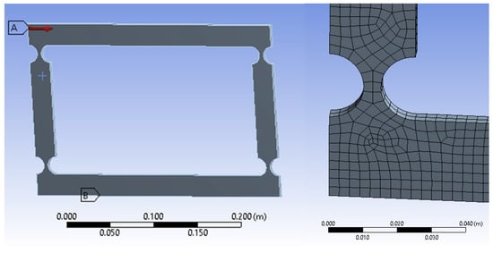 The four-bar compliant mechanism’s geometric model and the meshed section of the CFH created in Ansys (Academic version) are shown in Figure 11 below. To define the displacement boundary conditions, the lower (bottom) segment was fully fixed, indicated by letter B, in Figure 11 (left), with zero displacements imposed in all directions. The meshing of this geometry, shown in Figure 11 (right), was performed using quadratic quadrilateral (QQ) elements. A minimum possible element size of 3 mm, allowing for changes in the thickness dimension, was used. The quadratic elements offer more accuracy than linear ones. Regarding the force boundary conditions, a single surface force, , with a value ranging from 0.1 N to 200 N based on the t/R ratios, was applied to the top-left corner of the mechanism (indicated by letter A in Figure 11, left). These conditions are critical for simulating real-world scenarios and understanding how the mechanism responds to different external forces, which were used in the same method for the other FEM models of compliant mechanisms that were analyzed in this study.