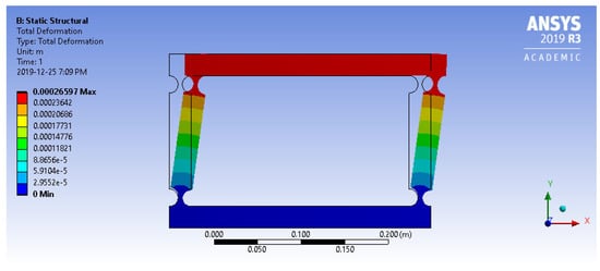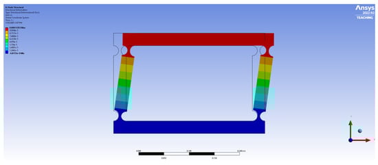 The effect of longitudinal distance between the vertical linkages (i.e., the coupler’s length, BC, in Figure 8) on the behavior of the four-bar compliant mechanism was also studied. It was confirmed that the distance between the vertical linkages did not affect the horizontal displacement and the mechanism’s performance remained consistent regardless of the coupler’s length, which is crucial knowledge for the design and optimization of compliant mechanisms.