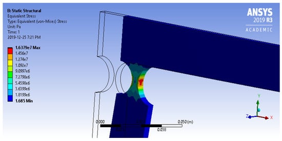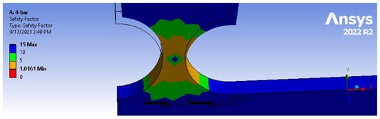 The analysis of the four-bar ABS plastic model has yielded valuable insights into its structural behavior under loading. For instance, when subjected to a 10 N force, the mechanism experienced a maximum equivalent (Von Mises) stress of 16.37 MPa, as depicted in Figure 13 above. This stress value is well below the tensile yield strength of ABS plastic (29.6–48 MPa). Therefore, it can be concluded that if subjected to a 10 N force, the mechanism will exhibit a substantial margin of safety in its design (safety factors of 1.8–2.9).
