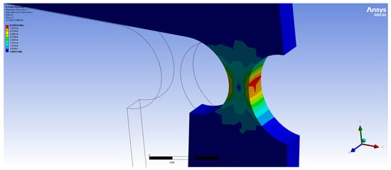 In parallel with the modeling of the ABS plastic variant, the modeling of a four-bar mechanism constructed from aluminum alloy 7075, adhering to the same design specifications and load and displacement boundary conditions, was undertaken. The total deformation of the aluminum alloy 7075 model under a 0.1 N load was 1.12 × 10−4 m. Figure 14 and Figure 15, respectively, illustrate the deformation and stress distribution of the aluminum alloy 7075 four-bar model under 0.1 N and 10 N loading conditions.