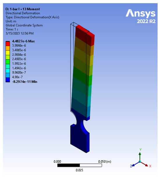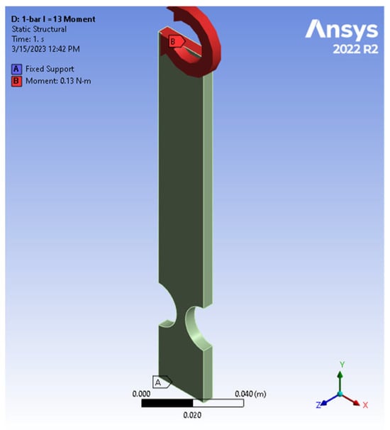 The cantilever bar possessed an arm length identical to the four-bar mechanism studied earlier and was subjected to a moment (refer to Figure 17). It is worth mentioning that a similar setup, subjected to an end force of an equivalent effect, was also tested. Identical end displacement and stress results were observed but the detailed comparison is omitted here for brevity. This methodology ensures consistent conditions and effectively replicates the effects of a moment on the cantilever compliant bar. Yong et al. (2008) [] explored compliant mechanisms utilizing single bars with flexure hinges, showcasing their versatility across various forces in both the x and y directions. By introducing a compliant cantilever bar made from aluminum alloy 7075, the results of the authors’ work extend the research reported by Yong et al. (2008) []. The results provided valuable insights into the cantilever bar’s behavior when subjected to a tip moment, allowing for a comprehensive comparison with the four-bar compliant mechanism under a force perpendicular to the axis of the link.