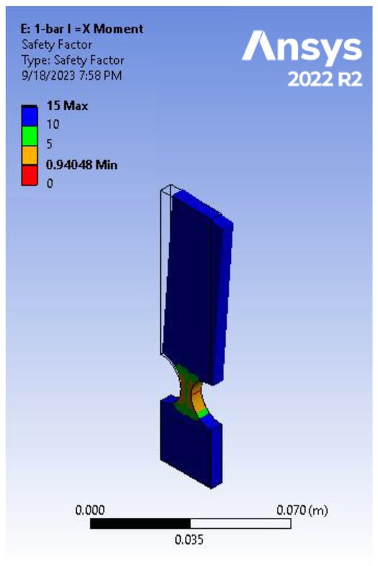 When considering the effect of the tip force/moment on the SF, the assumptions of the isotropic nature of the material and the pseudo-rigid-body behavior predicted an inverse linear relationship for a specific hinge geometry dimension. The results (Figure 21) verified both the assumptions and Equation (2) (R = 10, t/R = 0.4, L = 13 cm). Two moments were applied, 1.625 Nm and 1.3 Nm, where a 25% decrease in the moment corresponded to a 25% increase in the SF. Figure 21 illustrates the safety factors obtained for these two moments, showing a 25% increase from 0.93997 (failure) to 1.175 (safe design). These results highlight the critical importance of considering the force/moment as a design limit to ensure an appropriate safety factor based on the application.