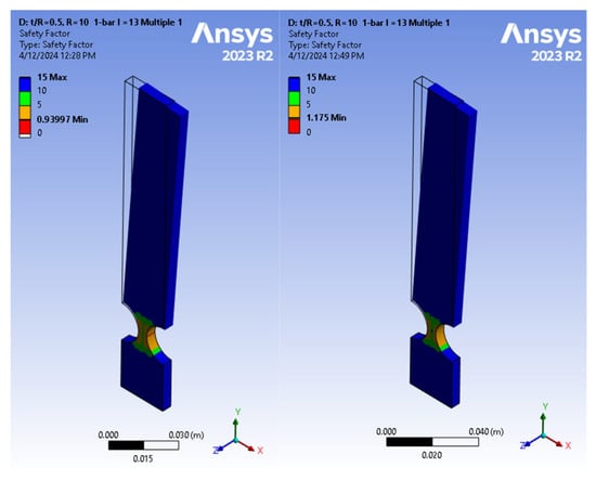 The fatigue safety factor (SF) is an important parameter used to evaluate the reliability and durability of a component or structure that undergoes cyclic loading. It shows the safety margin between the actual fatigue life of the material and the expected design life. A fatigue SF value below one means that the component will not last until the intended design life, whereas a higher SF represents more confidence that the component will withstand the cyclic loading without failure. For optimized design considerations, a fatigue SF = 1 means that the component is designed to exactly match the desired design life. The designer may, however, opt for a fatigue SF larger than 1 to provide a larger safety margin, depending on the specific application and desired level of reliability. The Ansys-based (numerical) fatigue study performed here investigated the SF for aluminum alloy 7075 subjected to fully reversed loading and a design life of 1 × 109 cycles.