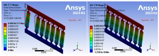 Figure 22 show the Ansys-based FEM modeling results for multi-bar compliant mechanism designs with seven and eight vertical linkages, both exhibiting identical horizontal displacement (0.00036 m, i.e., 0.36 mm) when subjected to tip forces of F7 = 116.66 N and F8 = 133.33 N (i.e., ()), respectively, while maintaining the same safety factor SF of 1.5 (with a difference of around 0.4%). This linear relationship in forces and deformation further validates Equation (5), highlighting the proportional behavior of compliant mechanisms with the number of vertical linkages.