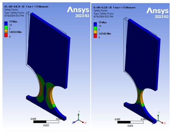 Continuing the investigation into the parameters contributing to the optimization design process, an FEA on the cantilever bar in Ansys was conducted to explore parameters such as t and R. These FEA-based models included three different radiuses (1 cm, 2 cm, and 3 cm), encompassing a wide range of t/R ratios ranging from 0.2 to 0.8. Figure 23 demonstrates how increasing the t/R ratio at a fixed radius of 30 cm led to a reduction in the SF at the hinges, from 1.82 to 1.03, providing a promising path for optimizing the design to ensure safety during fatigue tests and reducing weight, resulting in cost savings.