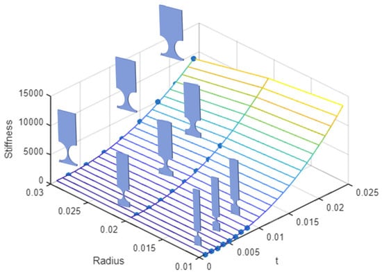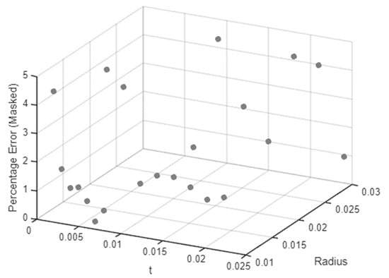 The plotted results from Equation (6) shown in Figure 26 depict the regression model for the rotational stiffness/compliance of CFH hinges compared with the results obtained from the FEA; they illustrate the variability in geometry across different hinges. Figure 27 shows the graph of the percentage error (thresholded), indicating the difference between the regression model and the actual FEA data. Higher-order terms were included for to reduce errors. The error range goes from 0.149% as the lowest value to 4.58% as the highest value, with an average error of only 1.74%, showing a reliable and fairly accurate fit. Considering the team’s future research developments, it would be advisable to also verify the presented empirical model experimentally, through laboratory tests on various linearly elastic materials. This would provide further insights into the materials’ performance and enhance the study’s overall value.