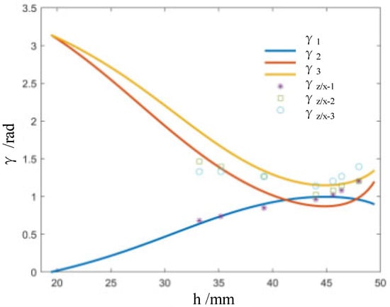 Further, according to Equation (4), following the changes of the nominal height , we compared the theoretically changing values with the actually changing values of , , and . As illustrated in Figure 3, the relationship between the opening crease angles and the nominal height is not linear, in particular, during the early elastic deformation stage. Further, the change trends of theoretical values and measured values of opening angles of the creases are basically the same, and their values are very close.